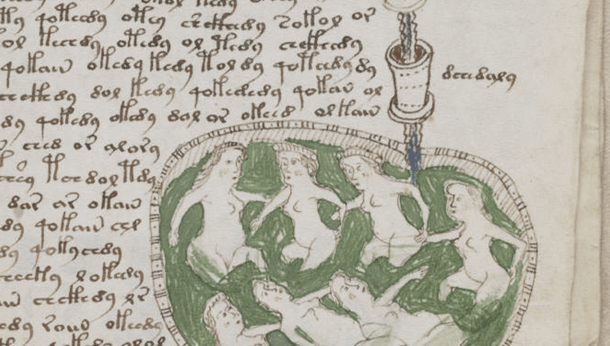 The Voynich Manuscript is a book-like text from the early 15th century written in an unknown script, accompanied by a bunch of puzzling doodles of people, animals (including a dragon), plants, castles, and astrological symbols.